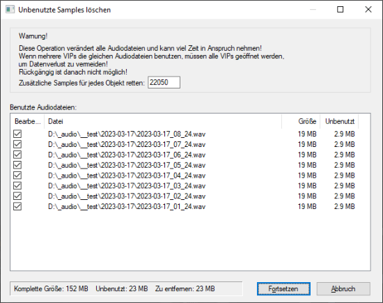 Achtung: Die Liste kann auch Dateien enthalten, welche aktuell nicht mehr im VIP genutzt werden, aber noch als Einträge in der Rückgängig-Liste auftauchen. Diese Dateien enthalten zu 100% ungenutzte Samples und würden daher komplett gelöscht werden. Das kann gewollt sein: Wenn Sie zum Beispiel eine Aufnahmesession komplett verworfen haben, können Sie so auch diese unbenutzten Dateien löschen. Wenn Sie jedoch Audiomaterial aus anderen Sessions oder Ihrer eigenen Sample-Library geöffnet hatten und diese später nicht mehr benutzt haben, sind auch solche Dateien nun zum Löschen ausgewählt. Löschen Sie daher vor Anwendung der Funktion die Rückgängig-Liste und schließen Sie alle unbenutzten Audiodateien.