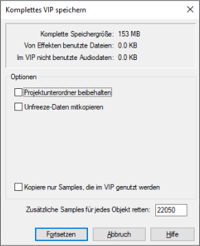 Wenn Sie die Option Nur im VIP benutzte Samples kopieren aktivieren, werden nur die Bereiche der Audiodateien kopiert, die von Objekten im Projekt auch benutzt werden. Mit dieser Funktion können Sie Speicherplatz sparen. Allerdings nehmen Sie damit in Kauf, dass die Objektgrenzen im neuen Projekt nicht mehr nach außen verschoben werden können, da alle Audiodaten außerhalb der Objektgrenzen nicht mehr verfügbar sind. Deshalb können Sie mit Zusätzliche Samples für jedes Objekt retten einen Sicherheitsbereich in Samples festlegen, der zusätzlich vor und hinter den Objektgrenzen in den Audiodaten verbleiben soll, um eine Reserve zu haben, wenn Objekt-Fade-ins/Fade-outs nachträglich geändert werden sollen. Der Standardwert beträgt 22050 Samples , das entspricht 500 ms bei 44,1 kHz Samplerate.