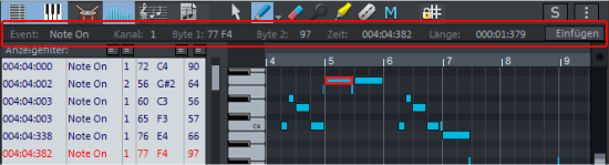 Einfügen: Fügt ein MIDI-Event mit den in den Bearbeitungsfeldern festgelegten Eigenschaften ein. Normale MIDI Events wie Noten oder CC-Events lassen sich leichter direkt im Editor erzeugen, Sie benötigen diese Schaltfläche nur für die Erzeugung von speziellen MIDI-Events (siehe unten).