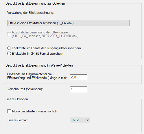 - Effekt in eine Effektdatei schreiben (._FX.wav): Alle auf eine Datei angewendeten Effekte werden in eine separate Datei mit dem selben Namen + Suffix