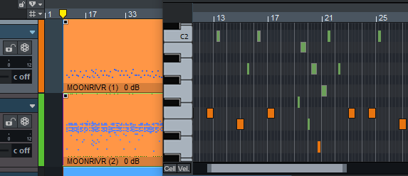 Velocity-Farben: Unausgewählte Noten (blau), ausgewählte Noten (rot) und aktuelles Event (hellrot umrandet) im Matrix Editor.