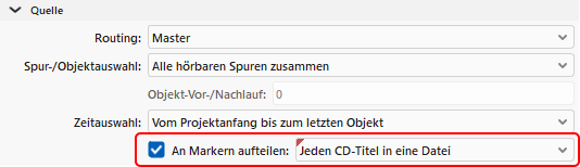 Benutzen Sie die Funktion Indizes an Objektkanten setzen, um bereits vorhandene Metadaten aus den Audiodateien der Objekte in CD Titel Indizes zu übertragen. Danach können diese Daten über den CD-Text/ID3-Editor bearbeitet werden. Um das Projekt in einzelne Dateien zu exportieren und dabei die Daten der CD-Titel-Indizes in die Metadaten (ID3-Tags) der exportierten Dateien einzutragen, wählen Sie im Exportdialog unter An Markern aufteilen die Option Jeden CD Titel in eine Datei.