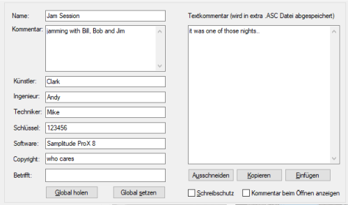 Hier können Sie Metadaten zum Projekt eingeben, die in der Projektdatei gespeichert werden, wie Projektkommentare, Angaben zum Copyright und zu beteiligten Künstlern und Toningenieuren.