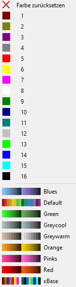 Mit dem Farbmodus lassen sich Objekte oder Spuren einfärben. Öffnen Sie nach Auswahl des Farbmodus erneut das Menü mit den Mausmodi, im unteren Teil des Menüs können Sie jetzt eine Farbe auswählen. Weiter unten im Menü gibt es noch andere Farbpaletten zur Auswahl. Klicken Sie auf eine Farbpalette, um die Farben im Menü durch die der gewählten Farbpalette zu ersetzen.