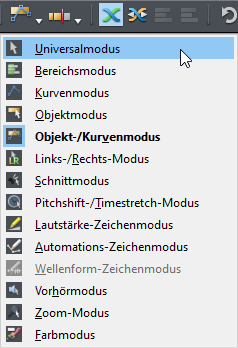 Die verschiedenen Mausmodi können Sie auch über das Menü Bearbeiten > Mausmodus auswählen. Um dieses Auswahlmenü an einer beliebigen Stelle im Projektfenster zu öffnen, können Sie: