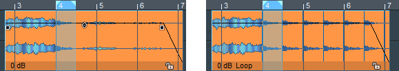 Das Objekt ist nun geloopt. Das Objektende lässt sich beliebig weit nach rechts ausdehnen, dabei wird das Audiomaterial zwischen Loop-Start und Loop-Ende wiederholt. Der Loopbereich wird im Objekt durch senkrechte Striche gekennzeichnet.