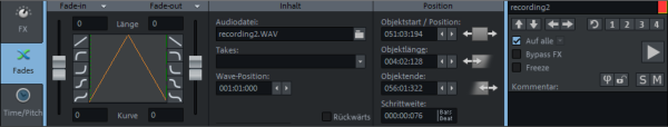 Der Objekteditor ist in drei Bereiche aufgeteilt: FX, Fades und Time/Pitch. Zum Bearbeiten von Objekten kann der Objekteditor stets geöffnet bleiben, seine Anzeige passt sich immer dem ausgewählten Objekt an, bei einer Mehrfachauswahl ist das das Objekt, das zuletzt der Auswahl hinzu gefügt wurde.