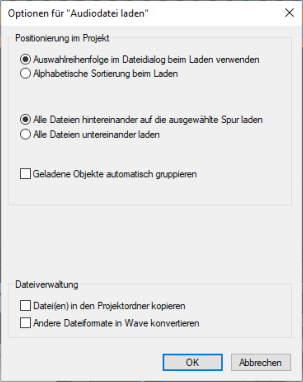 In diesem Dialog legen Sie verschiedene Optionen fest, wie Audiodateien beim Laden in ein Projekt behandelt werden sollen.