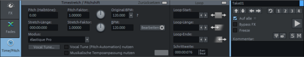 In dieser Ansicht können Objekte in der Tonhöhe (Pitchshifting) und im Tempo (Timestretching) verändert werden. Außer im Modus „Resampling“ kann dies gleichzeitig und unabhängig voneinander erfolgen.