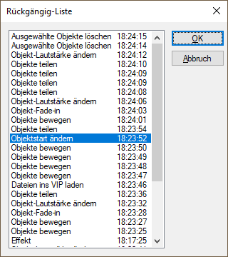 Über Menü Bearbeiten > Rückgängig-Liste… lässt sich eine Liste mit Kurzbeschreibungen aller Arbeitsschritte anzeigen, die für die Rückgängig-Funktion erfasst worden sind, zusammen mit der Uhrzeit, zu der Sie ausgeführt wurden. Wenn Sie einen Arbeitsstand anklicken, wird das Projekt in den Zustand versetzt, in dem es sich nach Ausführen dieses Arbeitsschritte befand. Dadurch können Sie schnell zu einem älteren Zustand zurückkehren, ohne alle Schritte einzeln nacheinander rückgängig machen zu müssen. Sie können sich auch mit den Pfeil hoch/Pfeil runter-Tasten durch die einzelnen Rückgängig-Schritte bewegen.
