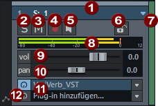 Spurnummer und -name: Durch Anklicken des Spurnamens oder der Spurnummer wählen Sie die Spur aus. Wiederholtes Klicken auf die Spurnummer bewirkt, dass die Darstellungshöhe der Spur zwischen flach und hoch hin- und hergeschaltet wird. Durch Doppelklick können Sie den Spurnamen bearbeiten. Durch Rechtsklick auf den Spurnamen öffnen Sie den „Spureinstellungen“-Dialog. Mit Klick auf den Pfeil können Sie weitere spurbezogene Funktionen aus einem Kontextmenü wählen. |