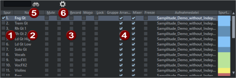 Der Spurmanager stellt alle im aktuellen Projekt enthaltenen Spuren dar und ermöglicht neben dem direkten Zugriff auf verschiedene Spureigenschaften wie „Solo“, „Mute“ und „Record“ auch das Verbergen von Spuren im Projektfenster oder Mixer.