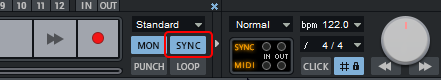 Zum Ein- und Ausschalten der Synchronisation benutzen Sie diese Schaltfläche auf der Transportkonsole oder Menü Datei > Eigenschaften des Projekts > Synchronisation aktiv (Tastaturkürzel: G).