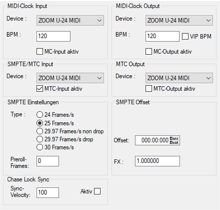 Preroll Frames: Hier können Sie eine Anzahl von Frames eingeben, die Music Studio ignorieren soll, bevor die Synchronisation startet. Damit kann darauf reagiert werden, dass analoge Geräte erst eine gewisse Zeit brauchen, um die korrekte Geschwindigkeit zu erreichen. Damit Music Studio nicht auf eine ungültige Zeit synchronisiert, werden die Preroll Frames übersprungen, bevor die Synchronisation greift.