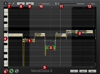Mit dem Vocal Tune Effekt können Sie den Tonhöhenverlauf eines Audio-Objekts bearbeiten. Zum einen ist es damit möglich, „schiefe” Gesangspassagen gerade zu rücken. Dies kann je nach Wunsch möglichst unhörbar oder auch drastisch verfremdend geschehen.