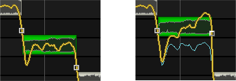 Tonhöhenkurven: Der resultierende Tonhöhenverlauf wird mit der gelben Tonhöhenkurve dargestellt. Der originale Tonhöhenverlauf wird mit der blauen Kurve dargestellt. |