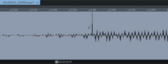 to draw in the waveform of a file. The waveform display shows a suitable zoom level, and the mouse pointer becomes a pencil. Changing the waveform in the wave project window is suitable for manually correcting individual very short glitches or drop-outs.