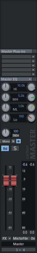 The In section is not present, the input signal is composed of all tracks and buses routed to the master. Therefore, there is also no section AUX. The Plug-Ins section, here called Master Plug-Ins works exactly the same as the one in Tracks. |