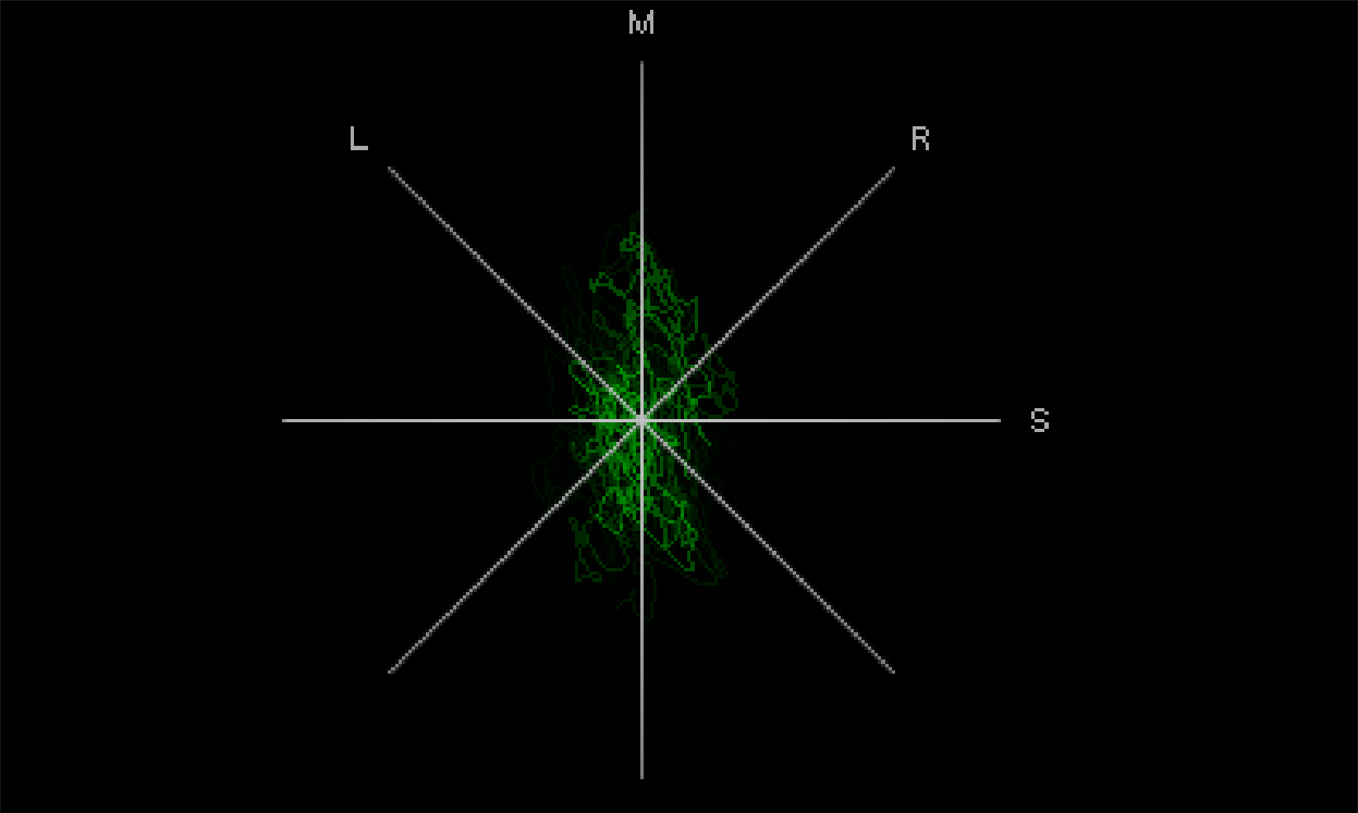 The Phase Oscilloscope gives you information about the distribution of the stereo image in your recording. A mono recording would be displayed as a vertical bar in this view. A stereo signal is by contrast shown as "diffuse ball," because multiple instruments were assigned to the mix in different panoramic positions.