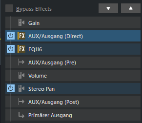 Die Positionen dieser Signalabgriffe innerhalb der Verarbeitungskette einer Spur sehen Sie im FX-Routing-Dialog. Hier im Bild entsprechen sie der Voreinstellung. Mit den Pfeil-Schaltflächen links oben lassen sie sich im Signalfluss verschieben.