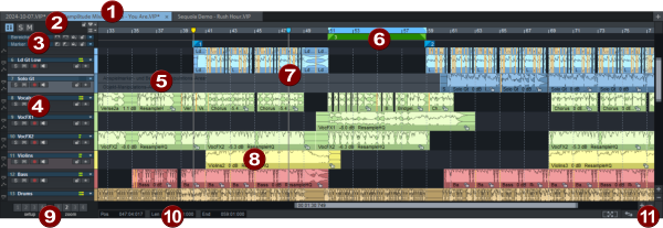Vertikal ist das Projekt in Spuren unterteilt, auf verschiedenen Spuren übereinander angeordnete Objekte werden gleichzeitig abgespielt. Die Lautstärken der Spuren können getrennt eingestellt werden und jede Spur kann mit anderen Effekten belegt werden. Eine Spur entspricht einem Kanal im Mixer.