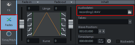 Um die durch das Objekt referenzierte Audiodatei auszutauschen, öffnen Sie den Objekteditor und wechseln Sie in die Ansicht Fades. Klicken Sie auf das Ordnersymbol rechts neben dem Namen der Audiodatei und wählen Sie eine neue Audiodatei aus.