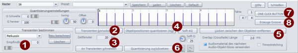 Mit dem ONE CLICK BUTTON werden die Befehle Transienten bestimmen, Transienten konsolidieren, An Transienten schneiden, Objektpositionen quantisieren (AQ) und Lücken zwischen den Objekten entfernen automatisch nacheinander ausgeführt.