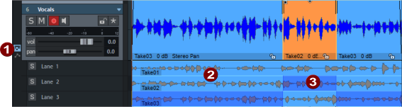 Wählen Sie das Objekt auf der Spur aus und öffnen Sie die Take Lanes mit dem Symbol am Spurkopf. Alle Aufnahmetakes werden unter dem Objekt dargestellt.