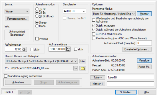 Dort können Sie alle Einstellungen für eine Audioaufnahme treffen. Der Dialog kann während einer Aufnahme geschlossen und auch wieder geöffnet werden. Im Dialog lässt sich auch die Aufnahme starten, pausieren und stoppen und während der Aufnahme Marker setzen. Für diese Aufgabe gibt es optional auch eine reduzierte Version des Dialogs, die nur die Bedienelemente dafür enthält.