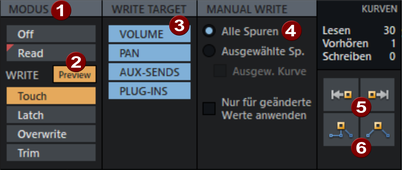 WRITE TARGET: Mit diesen Filtern können Sie das Schreiben der Automation für bestimmte Arten von Parametern (Volume, Panorama, AUX-Sends, Plug-in-Parameter) deaktivieren. Dadurch können Sie deren Automationskurven in Spuren vor Veränderungen schützen, obwohl diese Spuren in einem schreibenden Automationsmodus sind oder wenn manuell Werte geschrieben werden (siehe unten). Die bei Write Target deaktivierten Parameter werden von ihren Kurven im Read-Modus gesteuert, unabhängig vom gewählten Automationsmodus.