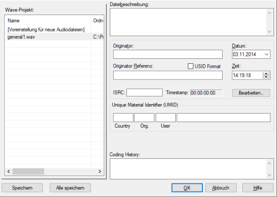 Mit Speichern schreiben Sie die BWF-Daten in die ausgewählte Datei, Alle speichern schreibt alle Änderungen, die im Dialog an den Metadaten vorgenommen worden sind, in die Dateien.