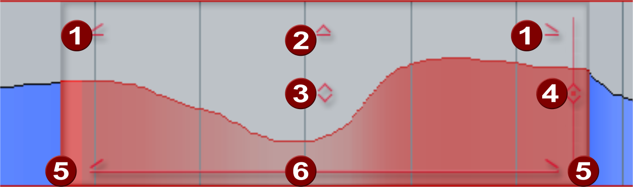 Auch die Werte der anderen Controller werden als Balken (4) dargestellt, die Breite des Balkens reicht dabei bis zum nächsten Events mit einem anderen Wert. Da sich Controller typischerweise in kleineren Zeitabständen mehr oder weniger stufenlos ändern - unabhängig von Noten-Events-, ergibt sich eine Darstellung als steigende oder abfallende Rampen. Auch hier repräsentieren die Höhe der Rampen und deren Farbintensität den zuletzt definierten Wert des jeweiligen Events. Ausgewählte Controller-Events werden ebenfalls rot dargestellt.
