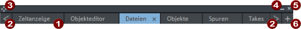 Tabs: Sie wechseln zwischen den Fenstern, indem Sie den entsprechenden Tab anklicken. Zur Neuanordnung der Docker-Tabs verschieben Sie die Tabs einfach per Drag & Drop an die gewünschte Stelle in der Tab-Leiste. Wenn Sie ein Fenster aus einem Docker herauslösen wollen, ziehen Sie es an seinem Tab aus dem Docker heraus. |
