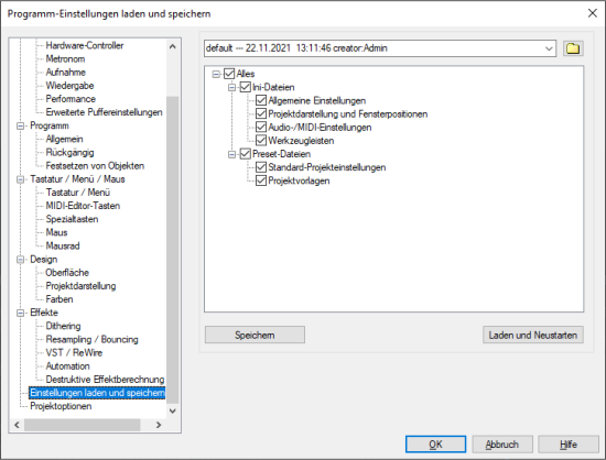 In diesem Abschnitt können alle Programmeinstellungen, Projektvorlagen und weitere Einstellungen gesammelt speichern und laden. So ist es möglich, die kompletten Programmeinstellungen auf einem mobilen Datenträger zu speichern und auf andere Samplitude-Workstations zu übertragen.
