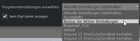 Tipp: Die Settings lassen sich auch beim Programmstart aus dem Startauswahl-Dialog laden!