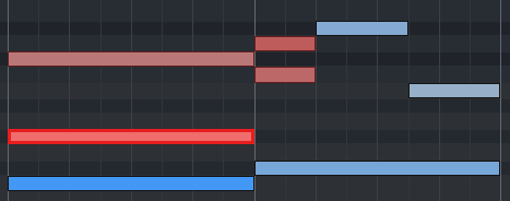 Velocity-Farben: Unausgewählte Noten (blau), ausgewählte Noten (rot) und aktuelles Event (hellrot umrandet) im Matrix Editor.