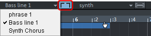 Im Menü werden alle im Projektfenster ausgewählten Objekte aufgelistet. Sie können dort das aktuelle Objekt auswählen. Ist die Schaltfläche daneben aktiviert, werden Bereiche außerhalb des aktivierten Objekts abgedunkelt und Events anderer Objekte blasser dargestellt. Das aktuelle Objekt erscheint dadurch hervorgehoben.