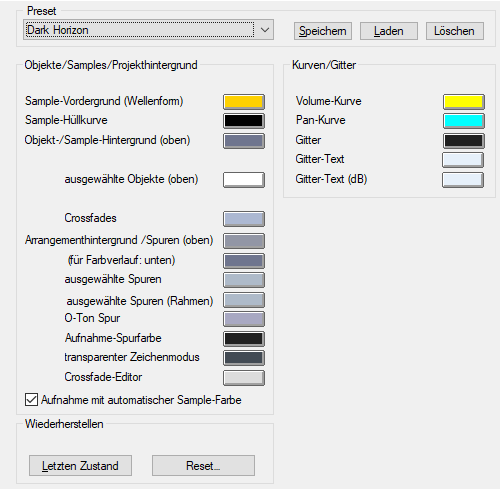 - Objektfarben: Diese Option setzt alle Objektfarben zurück. Dies kann zusätzlich notwendig werden, wenn Sie ein Projekt von einem anderen Computer importieren, der andere Farbeinstellungen hatte oder wenn durch automatische Sample-Farbvergabe bei der Aufnahme die Objekte von der Standard-Objektfarbe abweichen.