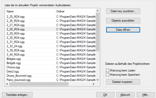 Der Dialog Projektdateien listet alle im Projekt verwendeten Audiodateien auf. Dabei werden Dateien, die sich außerhalb des Projektordners befinden, separat aufgelistet.