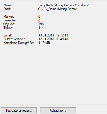 In diesem Dialog werden statistische Angaben zum Projekt angezeigt: Projektname, Pfad, Anzahl der Bereiche, Marker, Objekte und Takes, das Datum der Erstellung und der letzten Änderung. Im Menü unter der Schaltfläche Aufräumen… gibt es einige Funktionen, das Projekt zu optimieren und überflüssige Daten zu löschen.
