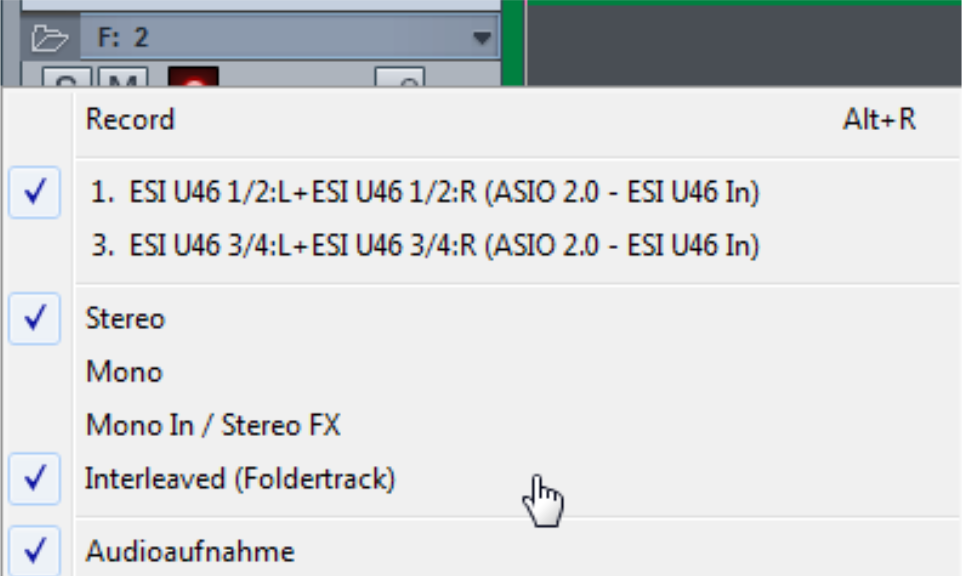 4. Klicken Sie mit rechts auf die Aufnahmeschaltfläche im Spurkopf des Foldertracks und wählen Sie im Kontextmenü Interleaved (Foldertrack).
