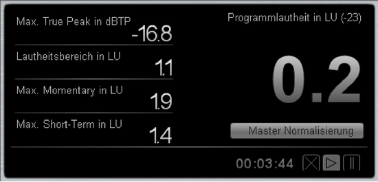 Mit der Schaltfläche Master Normalisierung stellt die Lautstärke des Master so ein, dass die gemessene Lautheit dem Zielwert entspricht. Wenn also z. B. die gemessene Programmlautheit 4 LU beträgt, wird die Masterlautstärke um 4dB verringert.