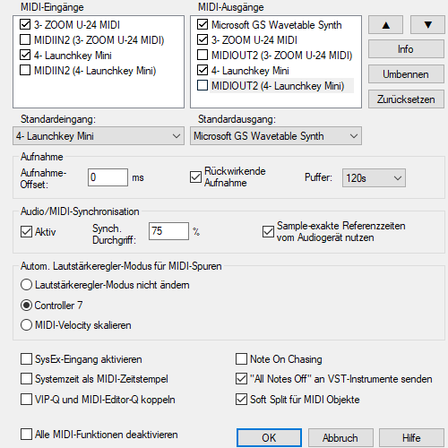 Systemzeit als MIDI-Zeitstempel: Wenn diese Option aktiviert ist, wird der Timestamp des MIDI-Gerätetreibers ignoriert. Dies kann helfen, wenn der Treiber einen nicht zum Audio synchronisierten oder gänzlich falschen Zeitstempel liefert. Bei MIDI-Aufnahmeproblemen mit MIDI-Geräten kann die Option eventuell Abhilfe schaffen.