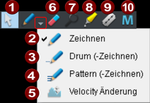 Die mit den Zeichnen-Modi erzeugte Noten erhalten den MIDI Kanal und Anschlagsstärke aus den Bearbeitungsfeldern über der Piano-Rolle.
