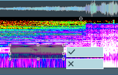 Damit keine hörbare Lücke entsteht, werden entnommene Bestandteile des Originalfrequenz-Spektrums aus dem Audiomaterial interpoliert, das die Störung umgibt. Bestätigen Sie die Korrektur mit Klick auf die Schaltfläche mit dem Häkchen.