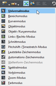 Für das Arbeiten im Projektfenster von Samplitude sind verschiedene Mausmodi wählbar. Je nach Modus ändert sich dabei die Funktion des Mausklicks im Projekt. Für die allermeisten Aufgaben ist der voreingestellte Universalmodus ausreichend, es gibt aber noch weitere Mausmodi speziell für das Bearbeiten von Objekten, Bereichen oder Automationskurven.