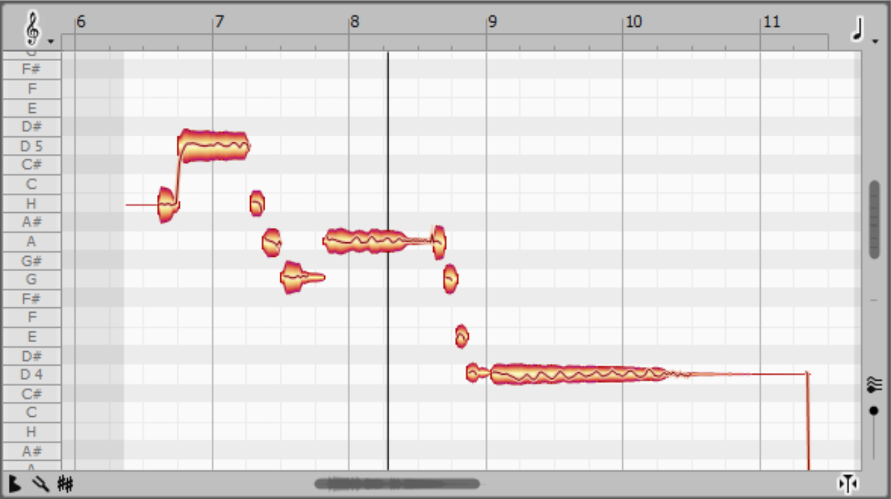 Wenn ein Audioobjekt durch Melodyne analysiert und/oder bearbeitet worden ist, wird der Tonhöhenverlauf auf dem Audioobjekt als Pianorolle dargestellt, analog zur Darstellung von MIDI-Objekten im VIP.