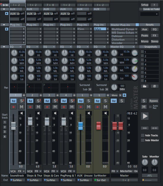 Es gibt außerdem noch zusätzliche Bedienfunktionen, die sich so nur im Mixerfenster finden, mit denen Sie z.B. Steuerelemente der Spuren miteinander koppeln, den Gesamtzustand des Mixers in Snapshots speichern oder Spureinstellungen wie Panorama oder Effekteinstellungen für alle Spuren zurück setzen können.