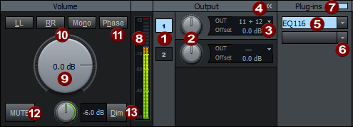 Plug-in-Slots: Die Plug-in-Slots funktionieren wie die in Mixer, Spur oder Objekteditor. Ein Linksklick auf auf einen leeren Slot öffnet den Plug-in-Browser, ein Linksklick auf ein geladenes Plug-in deaktiviert das Plug-in, ein Rechtsklick öffnet das Plug-in-Fenster. Sie können auch mehr als zwei Plug-ins laden, aber nur die ersten beiden werden in den Slots angezeigt. Die anderen erreichen Sie über den FX-Routing-Dialog. |