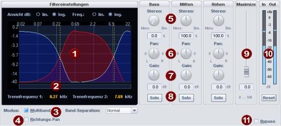 Der Multiband-Stereo-Enhancer erlaubt die Manipulation und Korrektur des Stereobildes in drei unabhängigen Frequenzbändern.